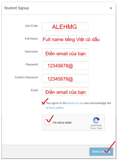 Username (tên đăng nhập) HÃY ĐIỀN EMAIL của bạn luôn nhé.Start the test: